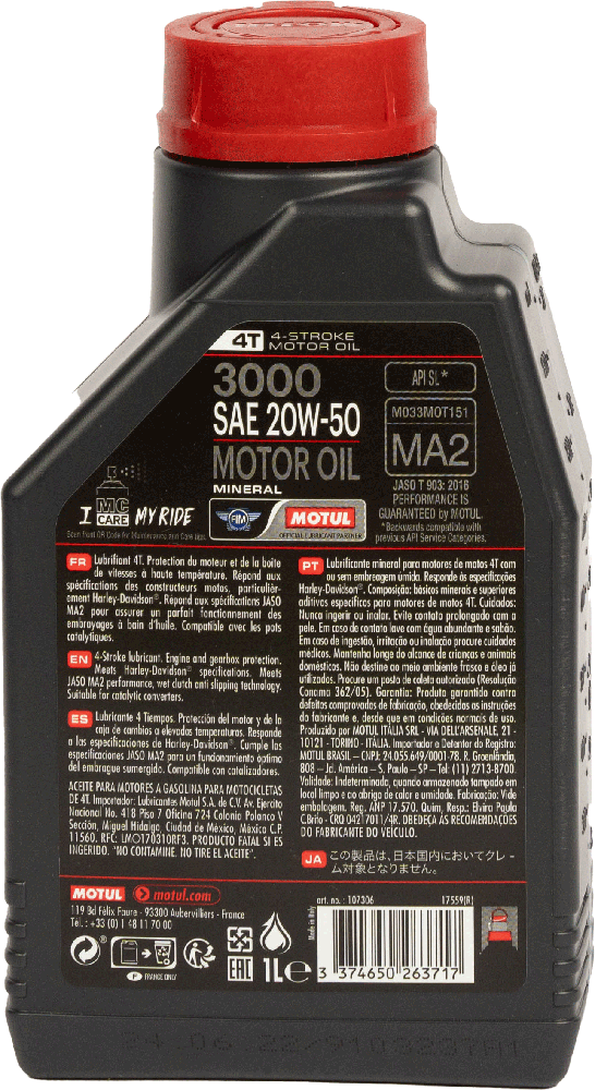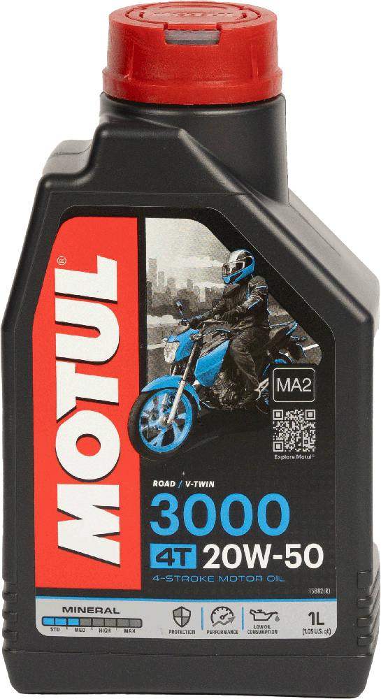 Lubricante para motores de motos de 4 tiempos 4T , tanto para los modelos con caja de cambios o velocidad y embrague integrados como para los que no. El aceite Motul 3000 20w50 además esta recomendado para aquellas motos que tienen y también las que no tienen convertidor catalítico.